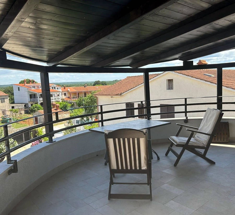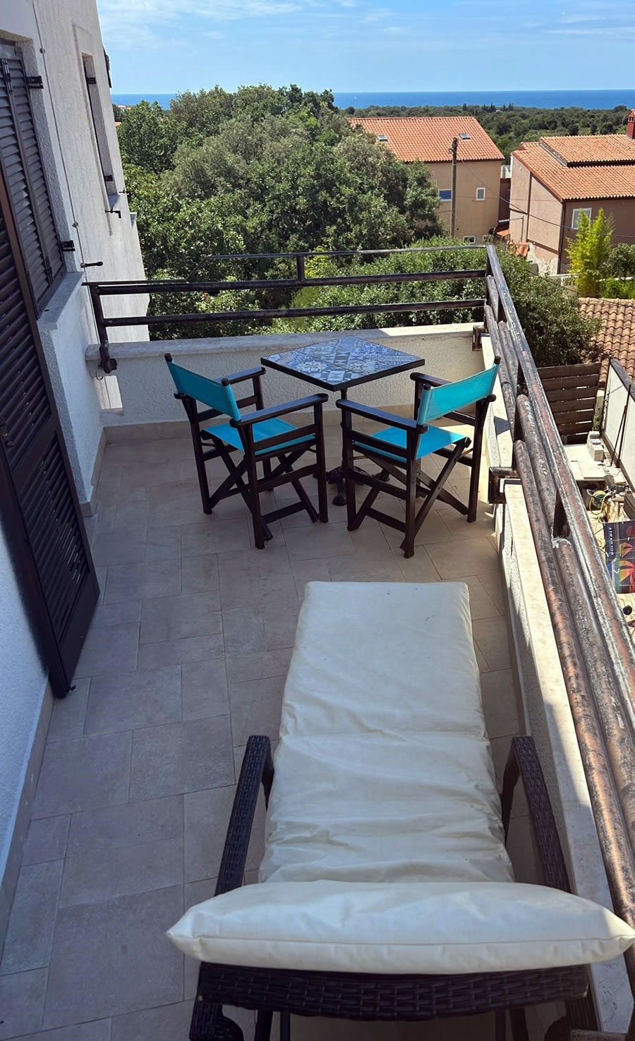 The other penthouse apartment of Villa Betiga Hills offers a view of the sea and the surrounding area. It has a 30 m2 balcony with a dining table and directors chairs, a table with two wooden reclining garden chairs with foot rest and a wooden sun lounger with a side-table.